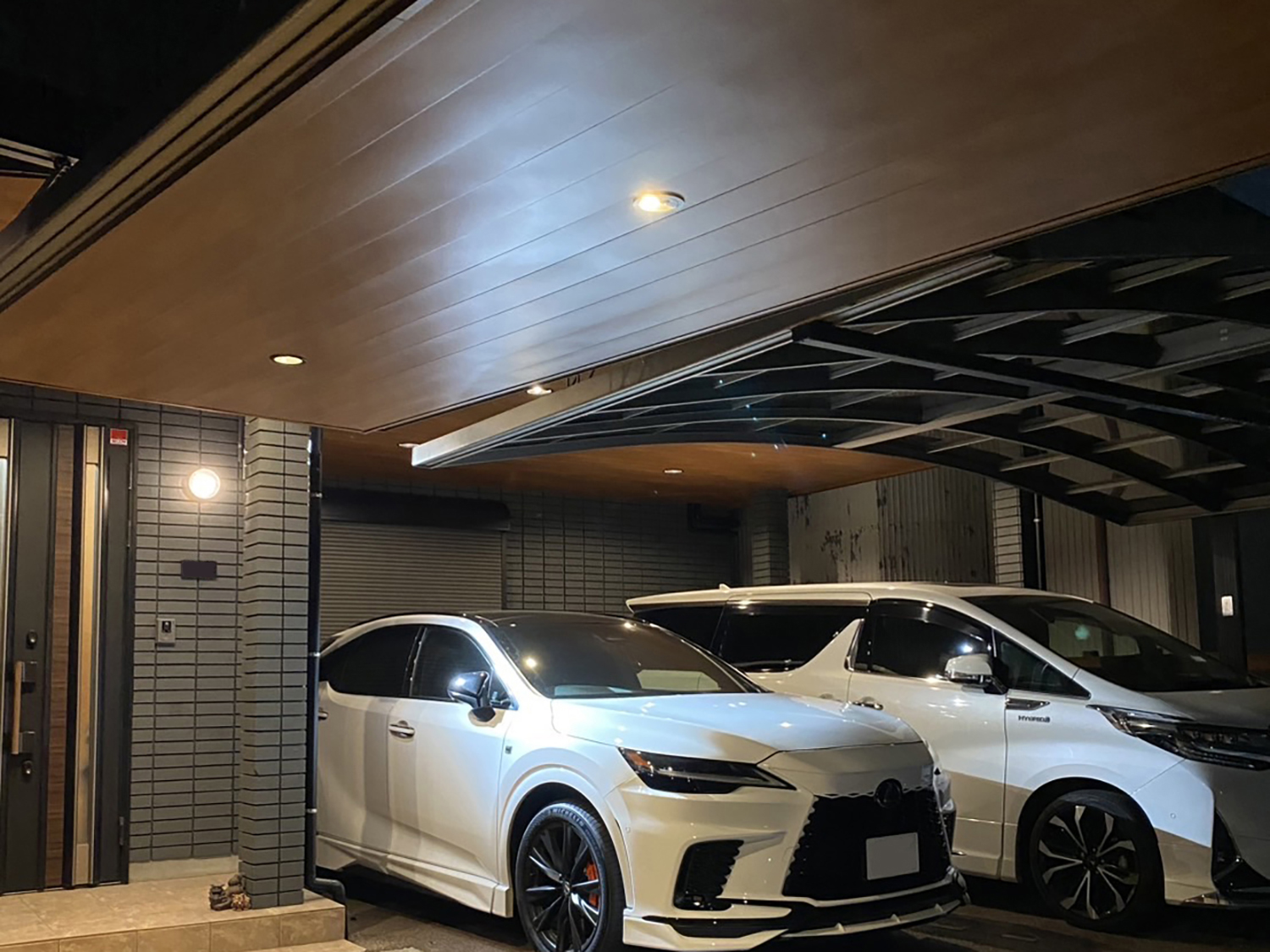 築25年の重量鉄骨3階建 外壁サイディングカバー工法にて、ガルバニウム鋼板(穴あき25年保証・塗膜15年保証)を使用。 既存レンガタイルに艶消し撥水塗装(ビーズコート)にして、外壁素材が違いながらも統一感を出し、ガレージ、玄関先、軒天に木目柄スパンドレールを用いて温かみのある印象をご提案しました。
